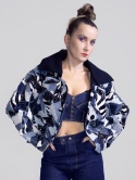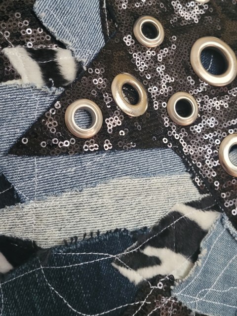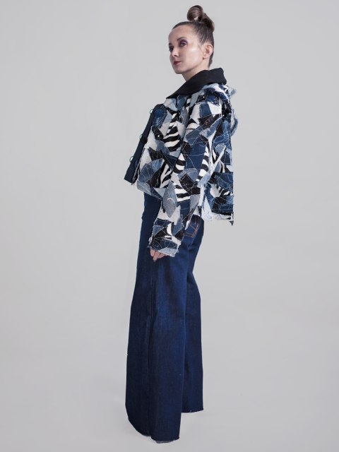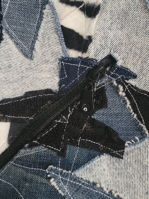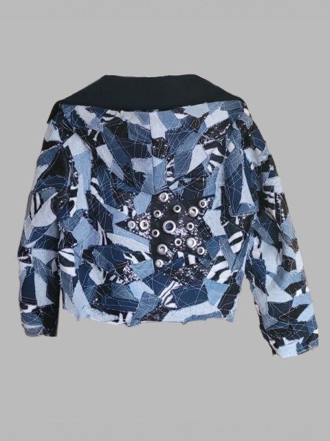 Ta misternie uszyta kurtka jest jak płótno artystycznej ekspresji, splecionej z kawałków tkanin, gdzie dominują odcienie jeansu. Jej charakter uwydatnia duży kołnierz i odpinany kaptur, który dodaje elementu zmiennego stylu. Zapinana z przodu na trzy guziki. Dwie wewnętrzne kieszenie zamykane na suwak, zapewniają praktyczną funkcjonalność, zachowując jednocześnie elegancję. Na plecach naszyta gwiazda z cekinowej tkaniny, ozdobiona metalowymi oczkami. Kurtka posiada podszewkę.
